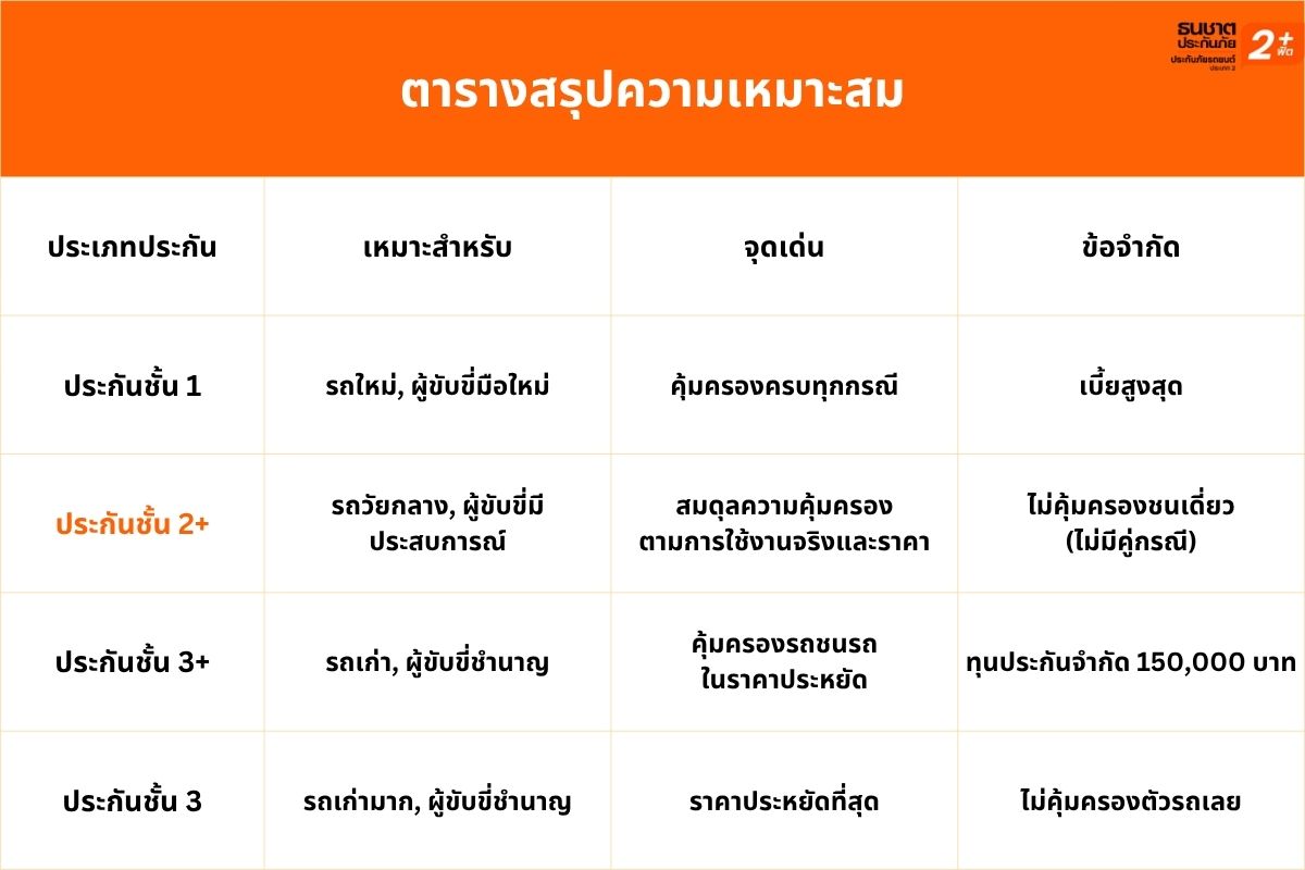 ขึ้นอยู่กับมูลค่าและการใช้งาน ควรเลือกประกันชั้น 2+ เพราะคุ้มครองครอบคลุมใกล้เคียงชั้น 1 รวมถึงการรถหายและไฟไหม้ ประกันชั้น 3+ อาจเหมาะสมกว่า เพราะประหยัดเบี้ยแต่ยังคุ้มครองการชนกับรถอื่นได้ ทั้งนี้ต้องพิจารณาค่าเบี้ยเทียบกับมูลค่ารถ