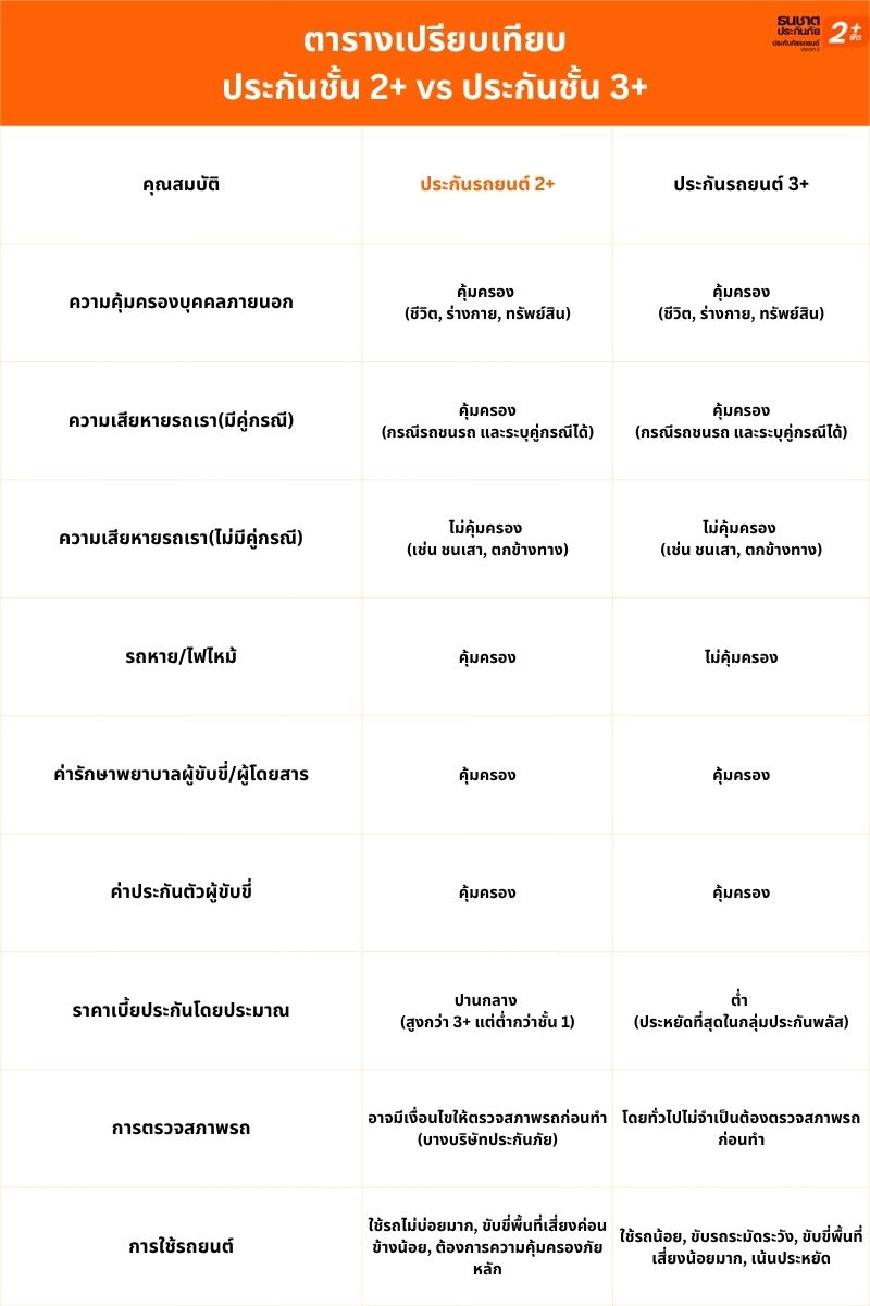 ก่อนที่เราจะไปเปรียบเทียบกันอย่างละเอียด ควรทำความเข้าใจก่อนว่า ประกันรถยนต์ 2+ และ 3+ นั้นเป็นการพัฒนาต่อยอดมาจากประกันรถยนต์ชั้น 2 และ 3 เดิม โดยเพิ่มความคุ้มครองที่ตอบโจทย์ผู้ขับขี่ที่ต้องการความคุ้มครองมากขึ้น แต่ยังอยู่ในราคาที่สมเหตุสมผล
